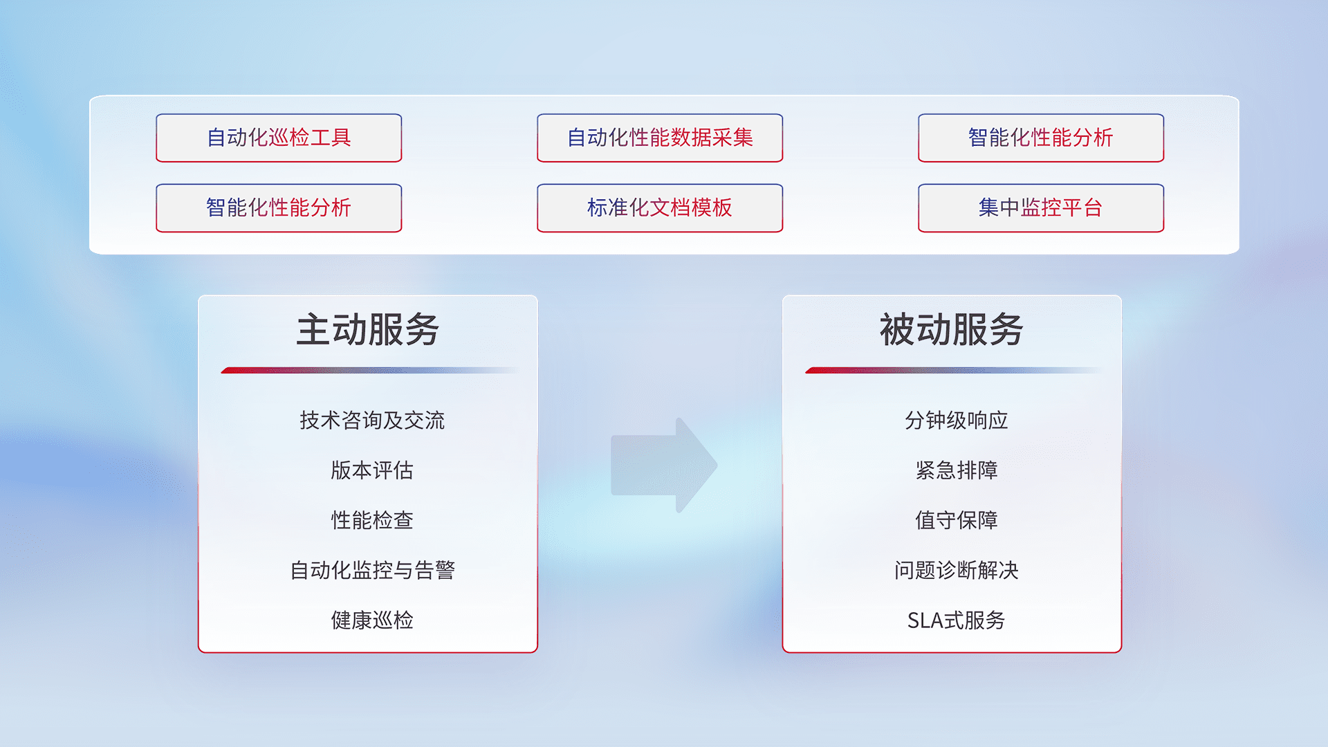 智能化工具和标准化文档,,保障服务质量,,提供主动服务(包含技术咨询、、版本评估、、、、性能检查、、自动化监控与告警、、健康巡检)和被动服务包含(分钟级响应、、、紧急排障、、、值守保障、、问题诊断解决、、SLA服务)。。。。